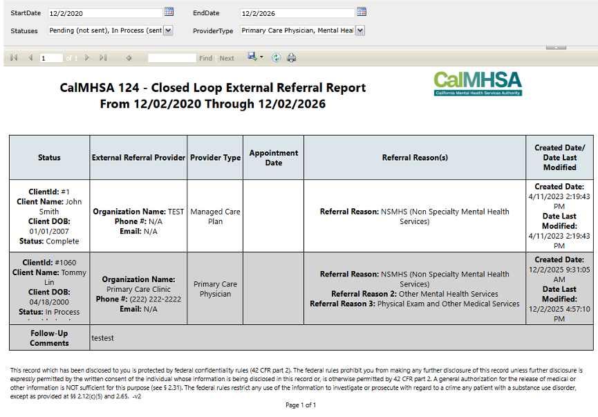 CalMHSA 124 – Closed Loop External Referrals Report | CalMHSA 124 – Closed Loop External Referrals Report (My Office) | N | RDLCalMHSAClosedLoopReferralReport | |