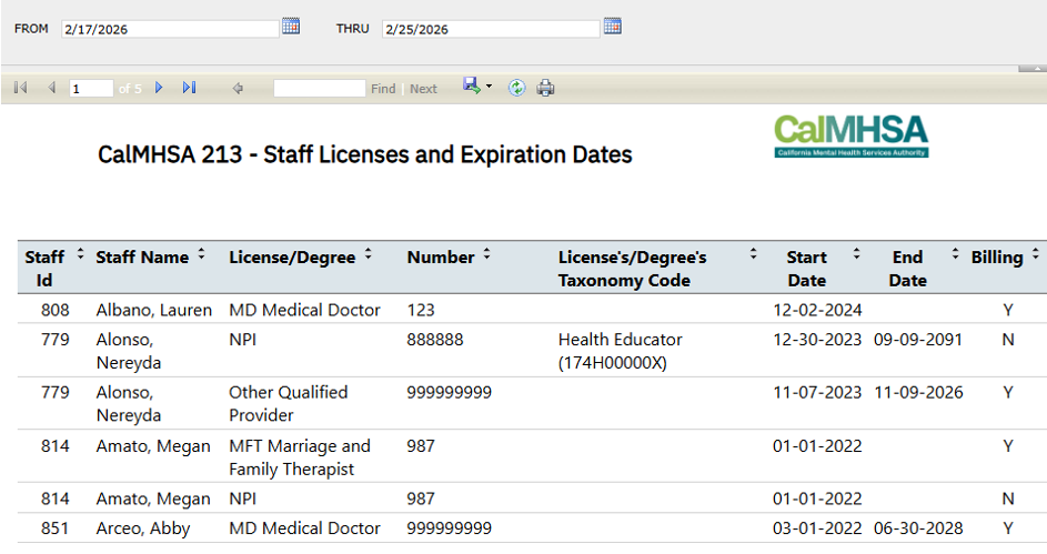 CalMHSA 213 – Staff Licenses and Expiration Dates Report | CalMHSA 213 – Staff Licenses and Expiration Dates Report (My Office) | N | RDLCALMHSAStaffLicensesExpirations | |