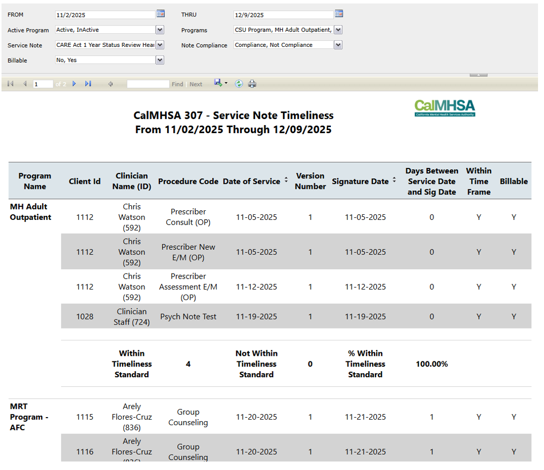 CalMHSA 307 – Service Note Timeliness Report | CalMHSA 307 – Service Note Timeliness Report (My Office) | N | RDLCALMHSANoteTimeliness | |