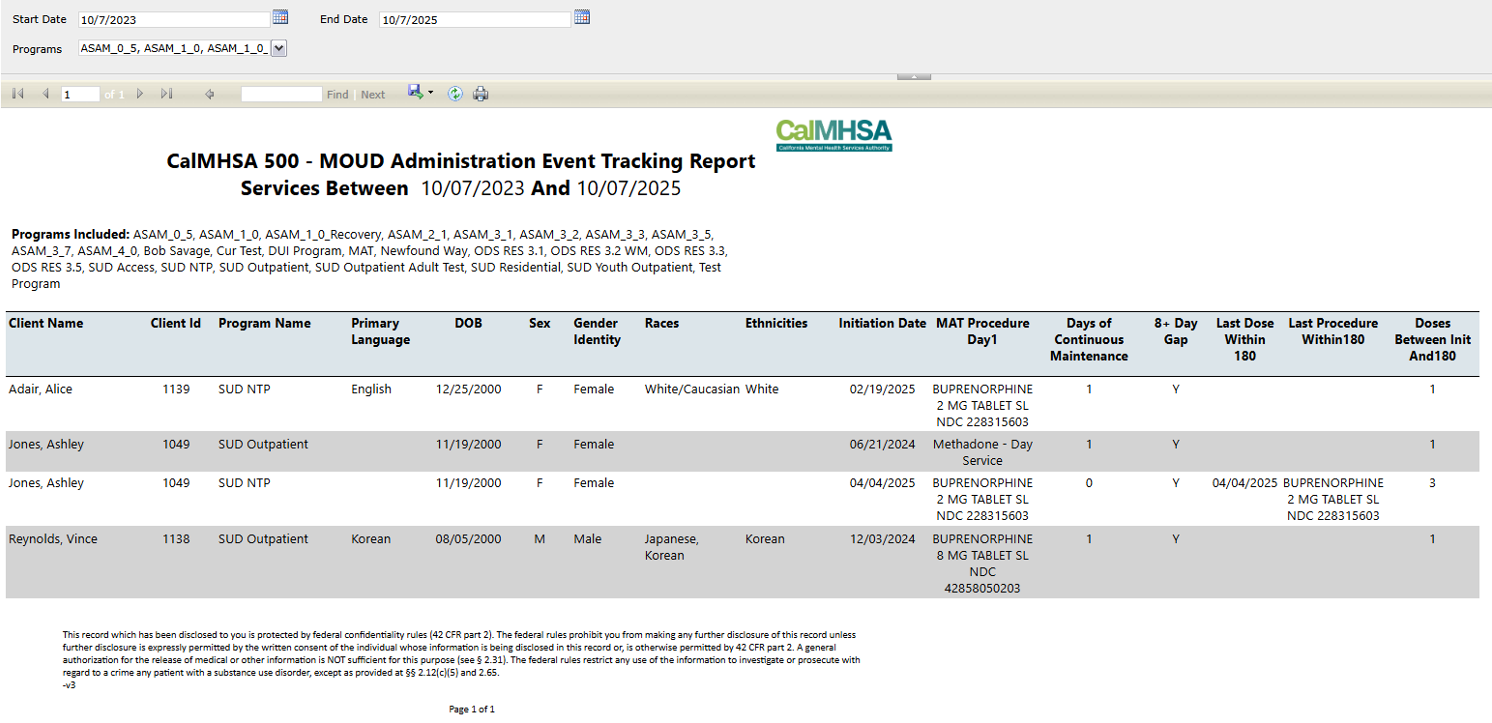 This report is designed to show MOUD administration events within a selected time range. The report supports tracking of continuous maintenance and indicates gaps within the first 180 days of MOUD treatment. The time range can be determined by the user through the Start Date and End Date filters. The report will display the client’s name, client id, primary language, date of birth, sex, gender identity, races, ethnicities, initiation date, the MAT service’s procedure code, the days of continuous maintenance, if there was a 8 days or more gap between services, the last dose given within 180 days, the procedure code of the last service within 180, and the amount of doses given between the initiation date and the 180 days. MAT services are determined by the procedure rates with the following billing codes: S5000, S5001, and H0020 | ||||