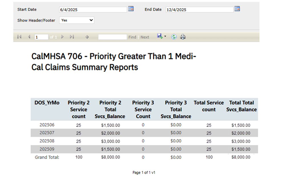 CalMHSA 706 – Priority Greater Than 1 Medi-Cal Claims Summary Report |