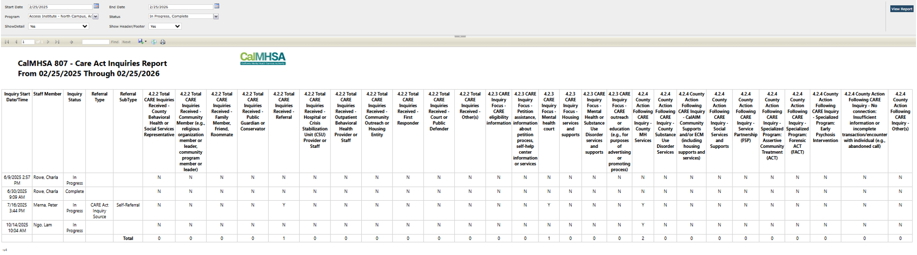 This report is designed to extract inquiry data from the SmartCare system. The report will track inquiries related to CARE Act services and would be used to be compliance with state reporting requirements.