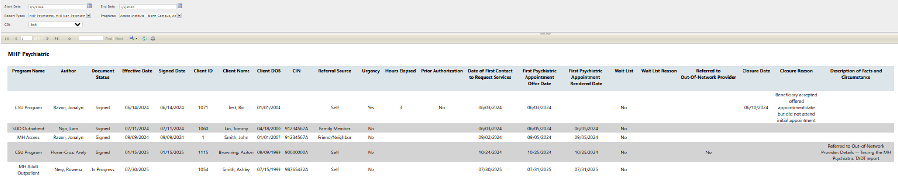 NonPsych | MH Non-Psychiatric SMHS Timeliness Record (Client) | Y | This dataset calls for a stored procedure labeled “csp_RDLCalMHSATimelinessReportNonPsychiatric”. In the stored procedure, it pulls in the following parameters: · StartDate · EndDate · Programs · ExecutedByStaffId · ClinicalDataAccessGroupId The stored procedure is designed to return data base on the following criterias: · Only pull MH Non-Psychiatric SMHS timeliness document data where the associated program is within the selected Programs from the Program parameters · Only pull the MH Non-Psychiatric SMHS timeliness document data where the document’s status is not equal to 26 (cancel status) · Only pull the MH Non-Psychiatric SMHS timeliness document data where the timeliness’s Document record and CustomDocumentCalMHSAMHNonPsychiatricTADTrecord is not soft deleted. · Only pull the MH Non-Psychiatric SMHS timeliness document data where the Staff member who is running the report have access to the client of that the MH Non-Psychiatric SMHS timeliness document data was created for. · Only pull the MH Non-Psychiatric SMHS timeliness document data where the Date First Contact to Request Services date is within the date range setup by the Start and End date parameters. Things to note with the stored procedure: · The “SignedDate” data that is returned is from the MH Non-Psychiatric SMHS timeliness document’s most current version signed date · Regarding the “IsUrgent” data that is returned, it will only show ‘Yes’ as long the IsUrgent column from the CustomDocumentCalMHSAMHNonPsychiatricTADTrecord is equal to ‘Y’. If the value is any other value (i.e. ‘N’, NULL, Blank, etc…) then it would show ‘No’ · Regarding the “HoursElapsed” data that is returned, as long the IsUrgent column from the CustomDocumentCalMHSAMHNonPsychiatricTADTrecord is equal to ‘Y’ the store procedure will display the hour differences from the DateFirstContactToReqServices and FirstServiceApptOfferedDate columns of the CustomDocumentCalMHSAMHNonPsychiatricTADTrecord. If the IsUrgent column is not equal ‘Y’, then the store procedure will display NULL · Regarding the “PriorAuthorizationRequired” data that is returned, if the IsUrgent and PriorAuthorizationRequired column from the CustomDocumentCalMHSAMHNonPsychiatricTADTrecord is both equal to ‘Y’ then the store procedure will display ‘Yes’. If the PriorAuthorizationRequired column from the CustomDocumentCalMHSAMHNonPsychiatricTADTrecord is NULL or not equal to ‘Y’ then the store procedure will display ‘No’. · Regarding the “WaitList” data that is returned, the store procedure will display ‘Yes’ as long the ReasonForDelay column of the CustomDocumentCalMHSAMHNonPsychiatricTADTrecord have value that is not blank or NULL. If the value is blank or NULL, then display ‘No’ · Regarding the “FollowUpAppt” data that is returned, the store procedure will display ‘Yes’ as long the IsFollowupApptNotOffered column of the CustomDocumentCalMHSAMHNonPsychiatricTADTrecord have value that is blank or NULL. If the value is equal to ‘Y’, then display ‘No’ · Regarding the “FollowupApptWaitTimeExt” data that is returned, the store procedure will display ‘Yes’ as long the DocumentationOfWaitTimeExt column of the CustomDocumentCalMHSAMHNonPsychiatricTADTrecord have value that is not blank or NULL. If the value is blank or NULL, then display ‘No’ · Regarding the “CIN” data that is returned, the store procedure will display the MAX (biggest) InsuredId columns of all non-soft deleted, CoveragePlanId = 2 ClientCoveragePlans records that are associated to the client that the CustomDocumentCalMHSAMHNonPsychiatricTADTrecord is associated to.