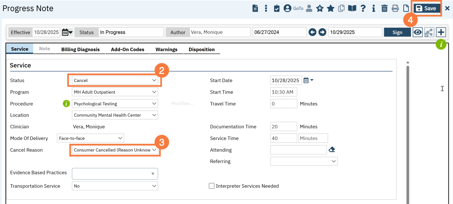 - The Progress Note screen will open, click the drop-down menu in the Status field and select Cancel.