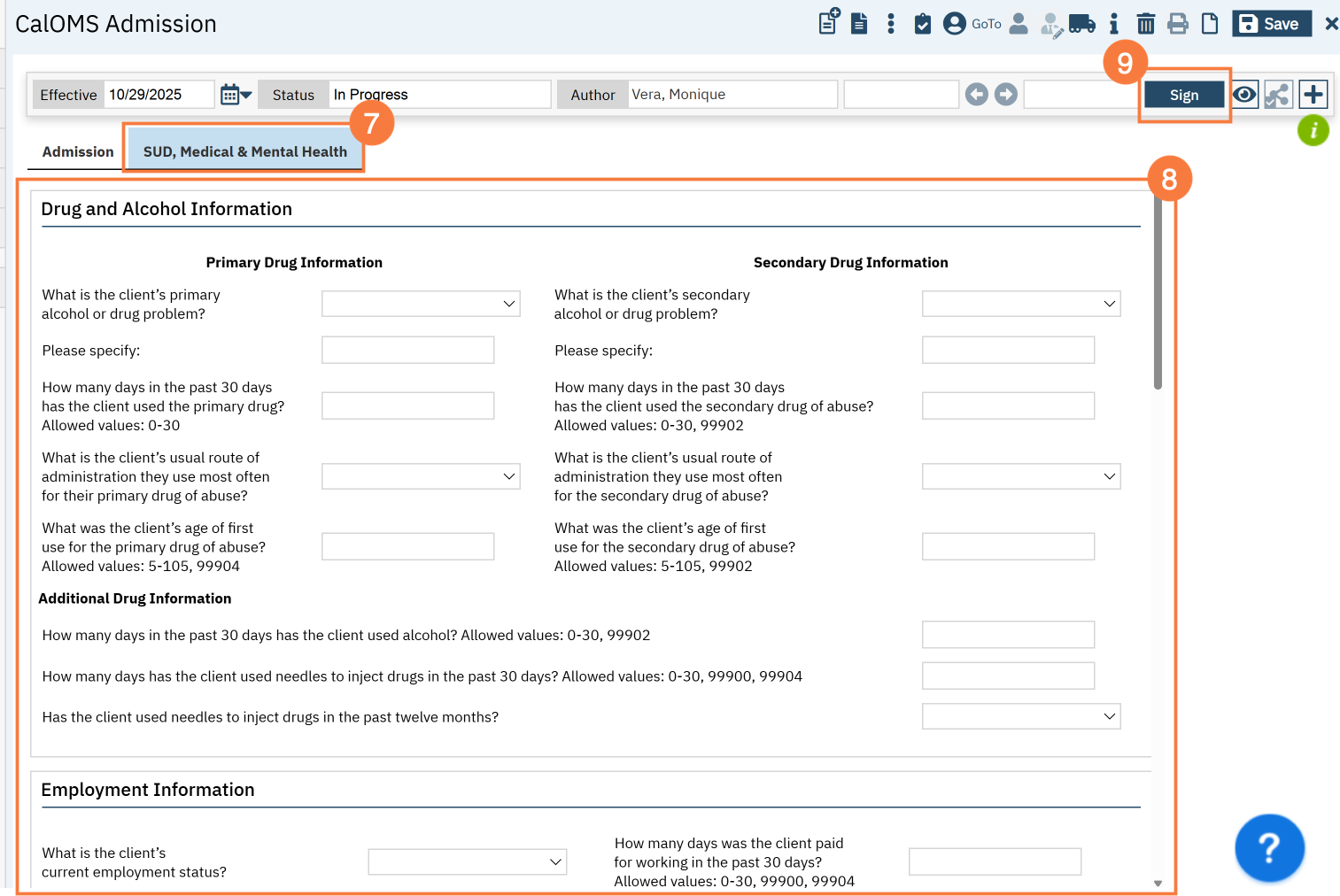 - The CalOMS Admission document will open. Some fields will have pre-populated data from the CalOMS Admission, all other fields need to be filled out. Complete the document. Use the tab key to navigate between fields.