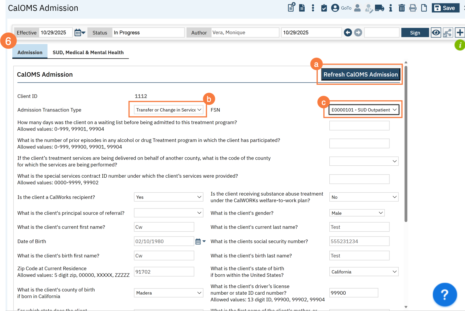 - If you notice the client information is incorrect, such as DOB, you can click Save and navigate to the Client Information (Admin) screen to fix the error. When you come back, click the Refresh CalOMS Admission button to bring in the corrected information.