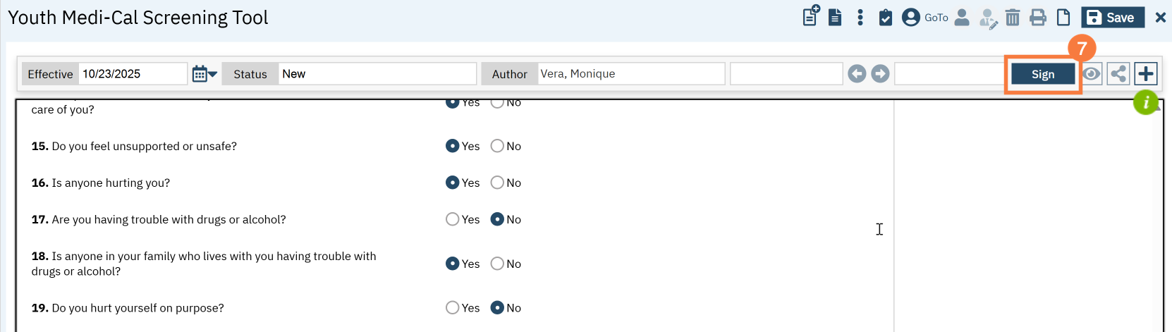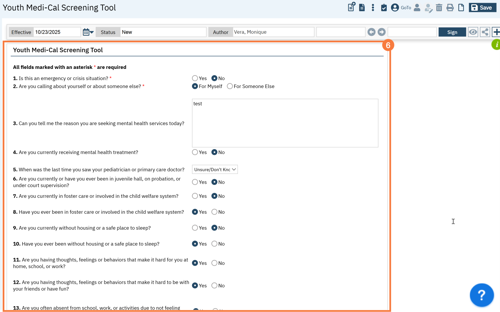 - The Youth Medi-Cal Screening Tool document will open. Complete the document. The wording of the questions varies slightly depending on if you’re screening the youth directly or gathering information from a parent or guardian. The system will automatically alter the language to match the appropriate DHCS form.