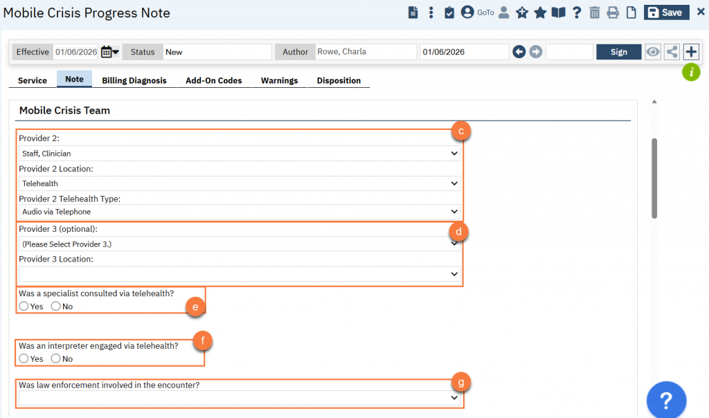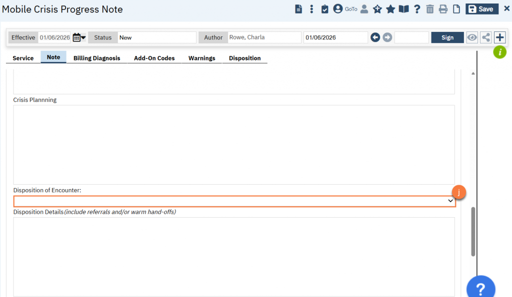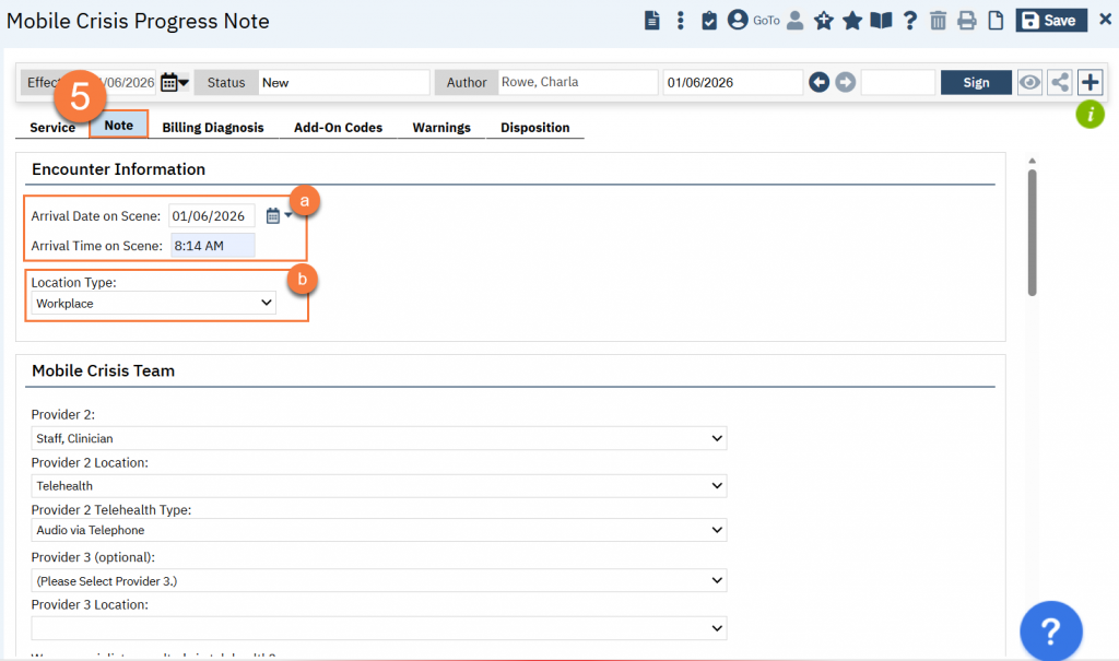 - Select “Mobile Crisis Encounter” in the Procedure field. This will create the Note tab.