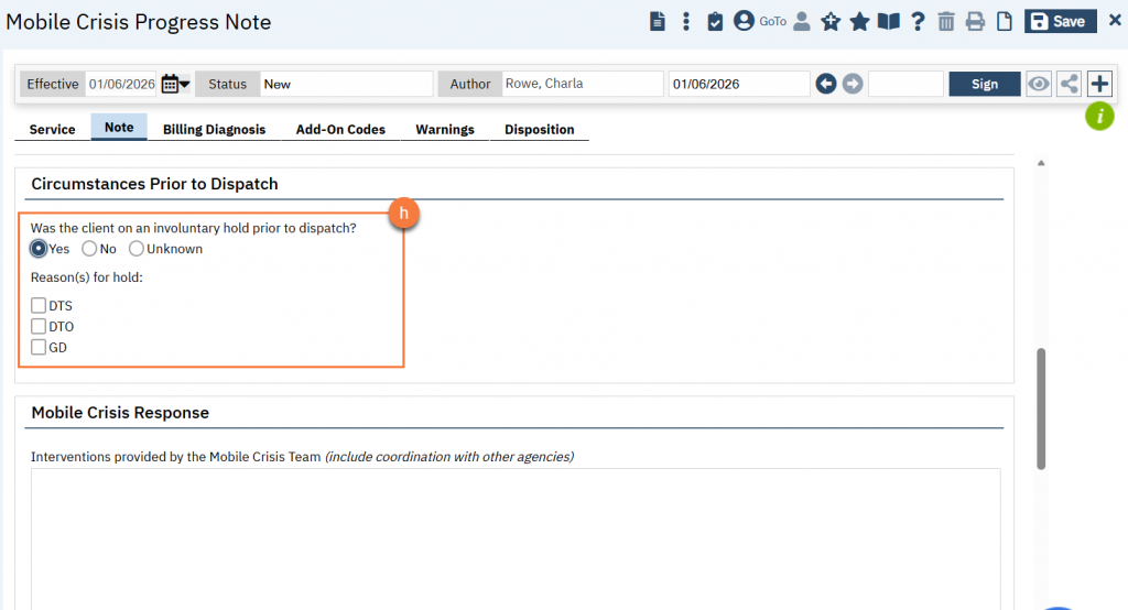 - In the Mobile Crisis Response section, there are multiple narrative fields to help you document what occurred. This includes interventions provided, crisis planning completed, and how the encounter ended. Make sure to include any coordination with other agencies, what referrals were made, and any warm hand-offs that occurred.