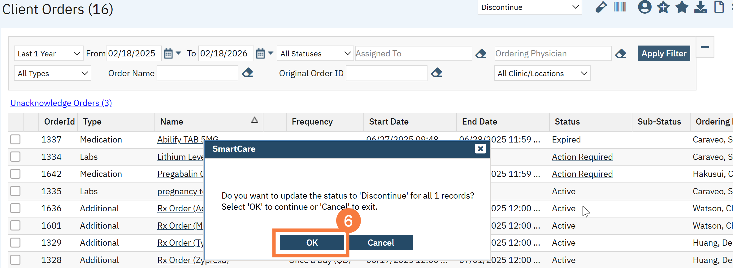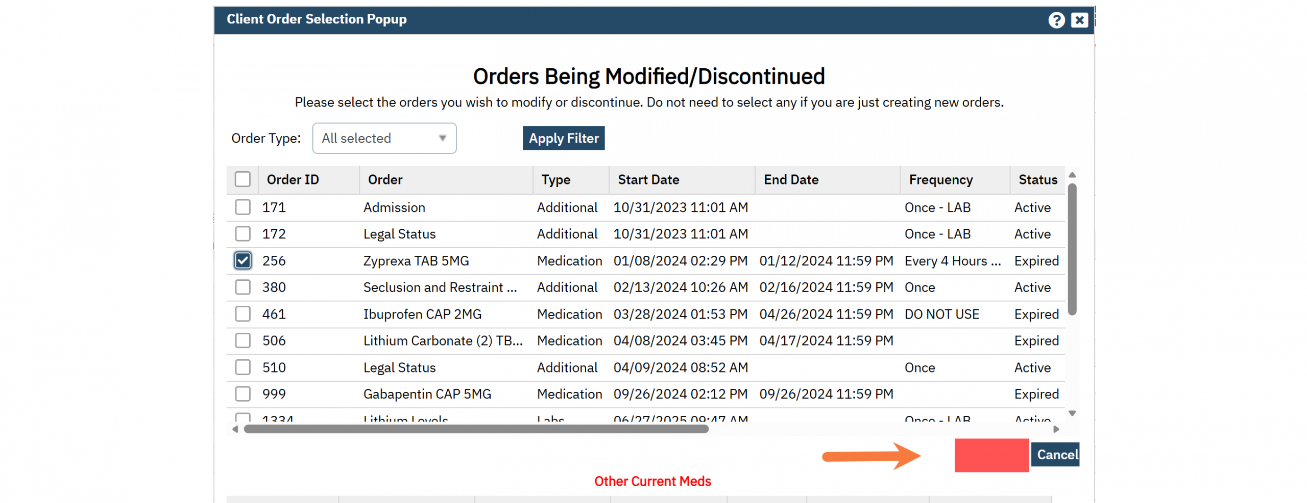 1. This will bring you to the Client Orders (Client) list page.  Click the checkbox for the medication you want to discontinue or modify.