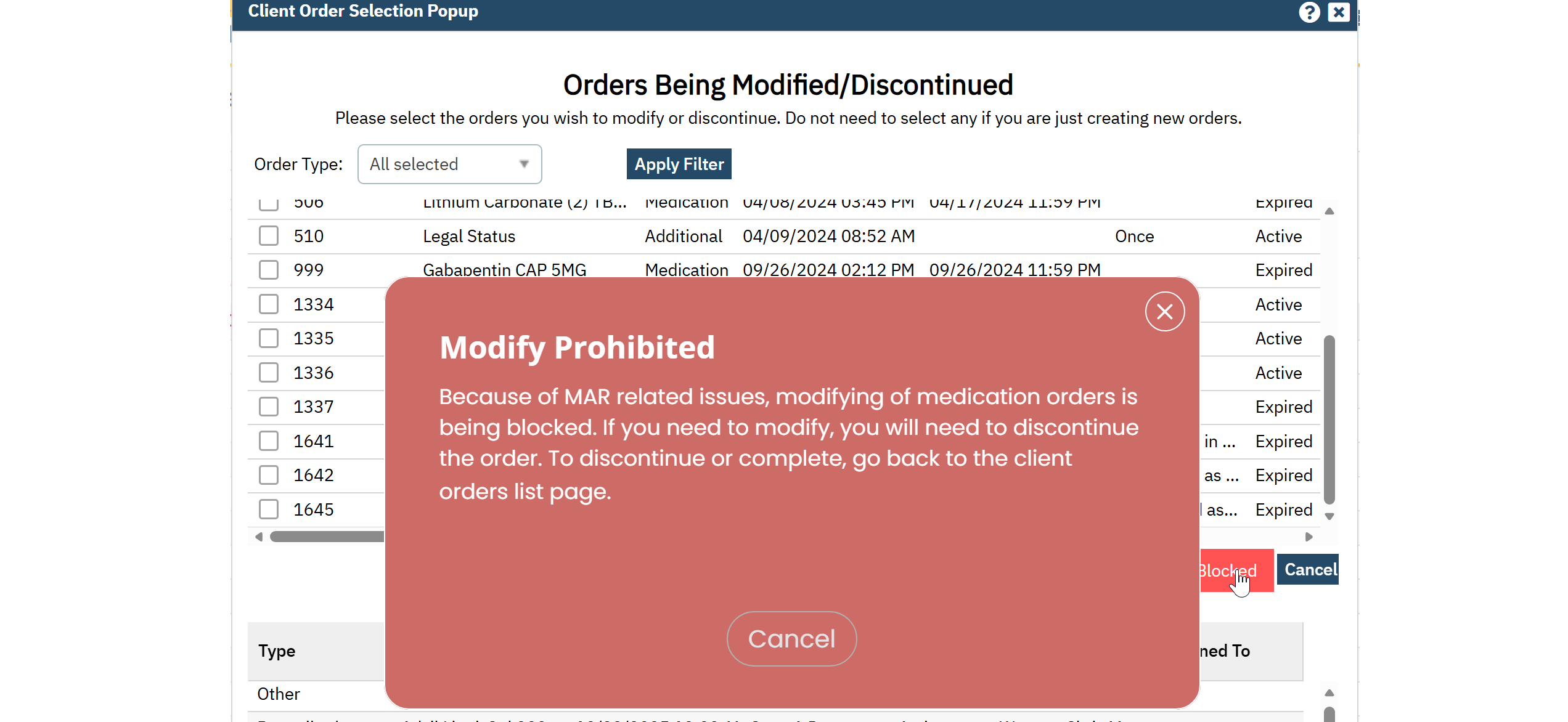 System Behavior When Attempting to Modify a Medication Order Incorrectly