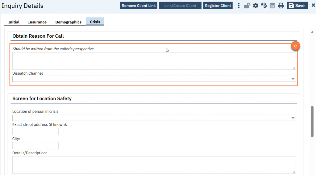 - Enter any details or description about the location of the person in crisis and explore with the caller if the location of the crisis is safe.