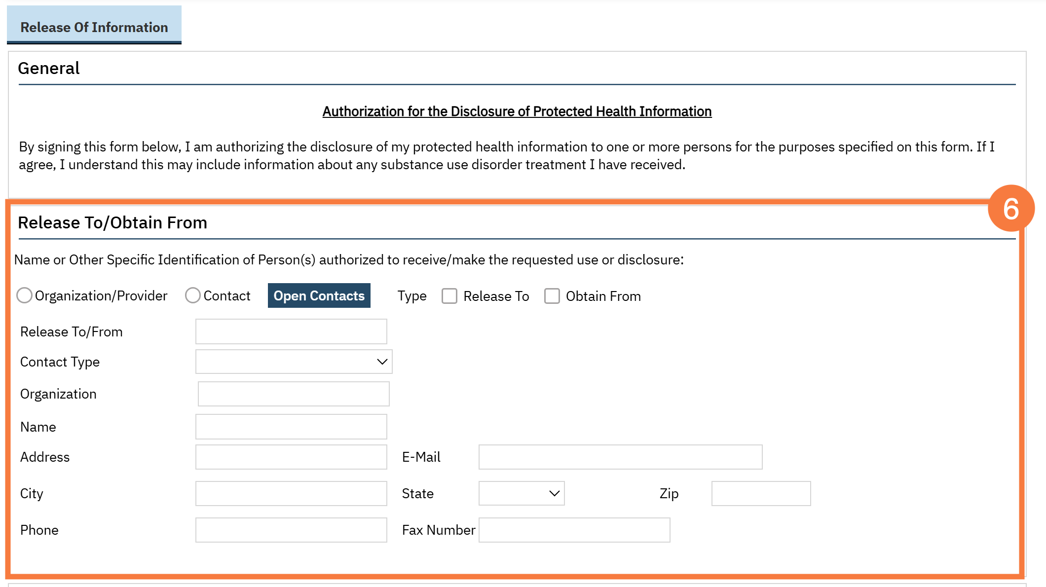 - This will bring you to the Release of Information document. Complete the “Release To/Obtain From” section. This section is the person or entity that you’ll be sharing information with.