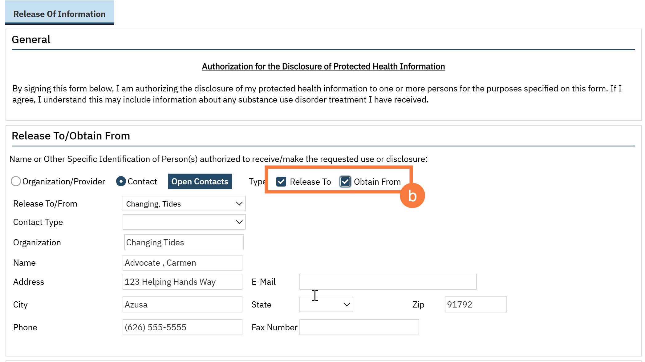 - Select whether you will be releasing information to this person/entity and/or obtaining information from this person/entity. You can select one or both, but must select at least one option.