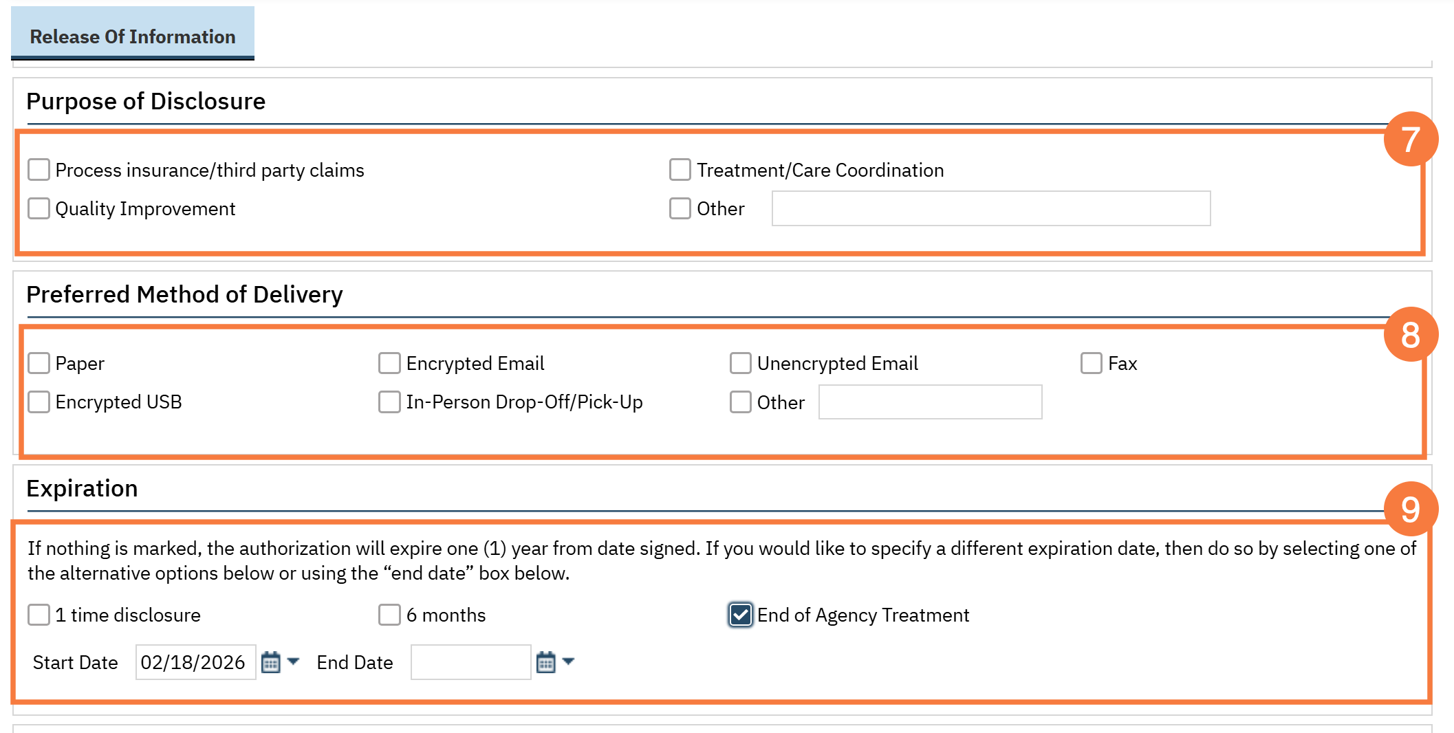 - Complete the “Purpose of Disclosure” section. This is the reason you’re sharing information with the person/entity listed in #6 above. Most frequently, the purpose will be “Treatment/Care Coordination”. If you select “Other”, make sure to clarify in the text field. You must select at least one option, but can select more than one, if applicable.