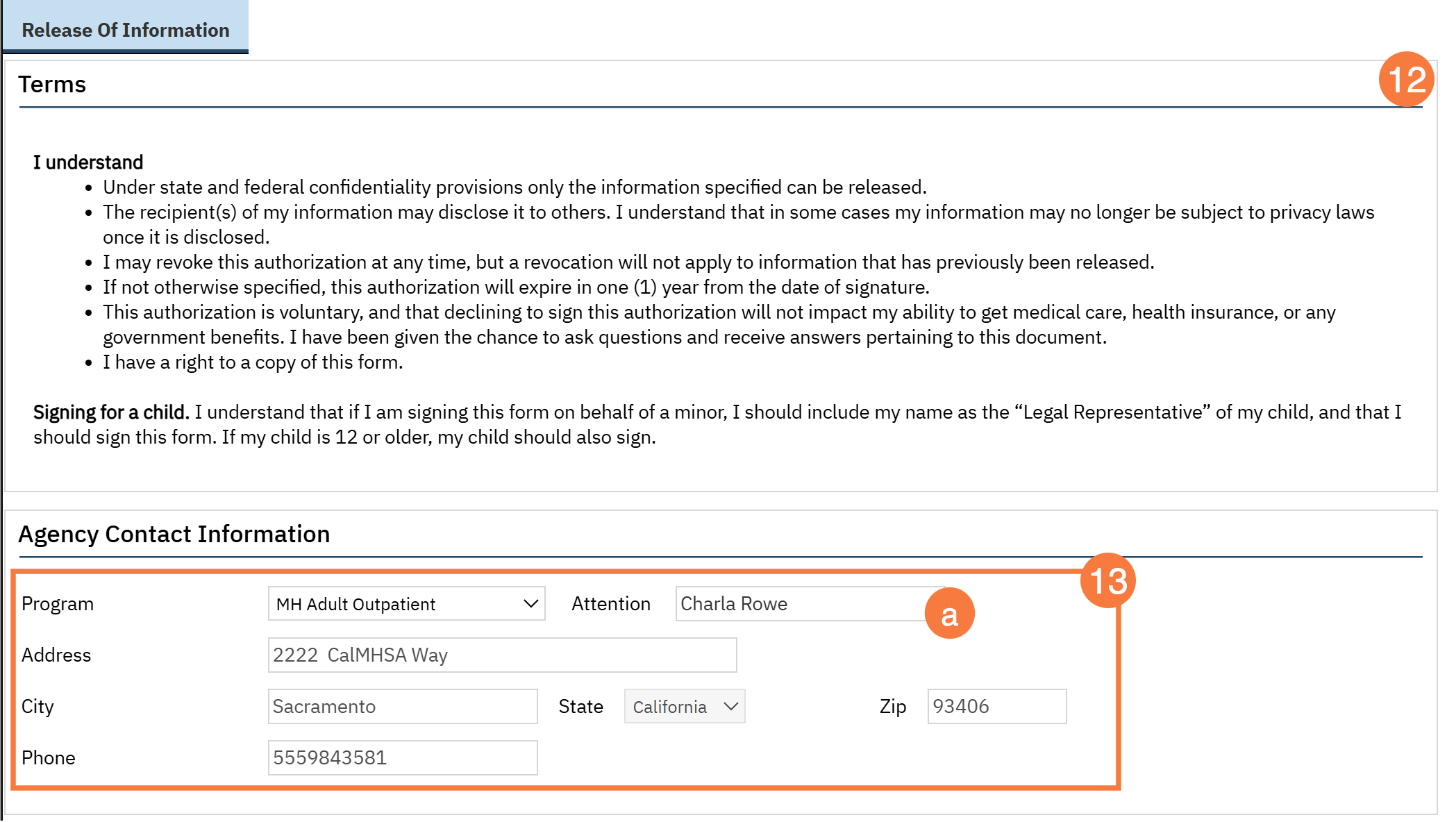 - The terms section provides the client with information about the authorization they’re signing. Make sure to review this information with the client before signing.