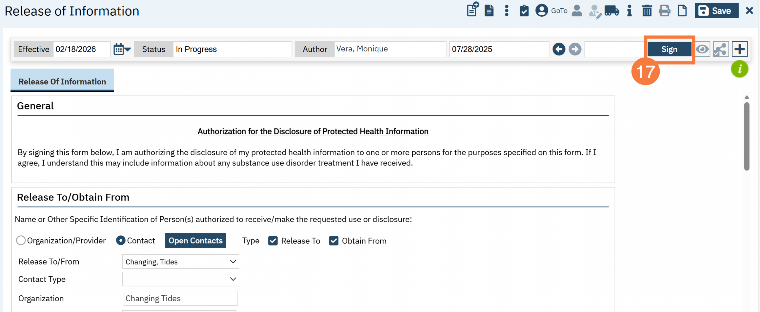 - Document whether the client is authorizing or prohibiting the release of SUD and HIV/AIDS information.