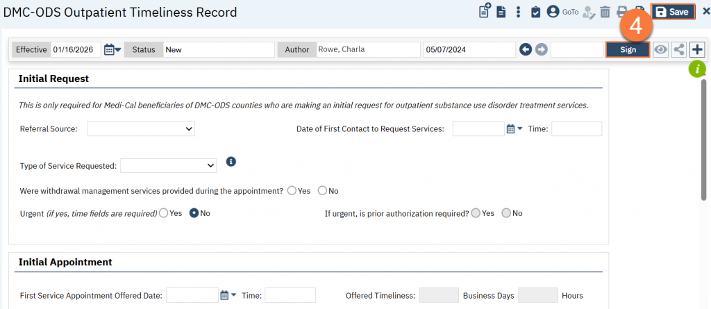 - This takes you to the timely access record document. Enter as much information as you have. Click Save to save the record. When the record is fully complete or closed out, click Sign to finalize the record.
