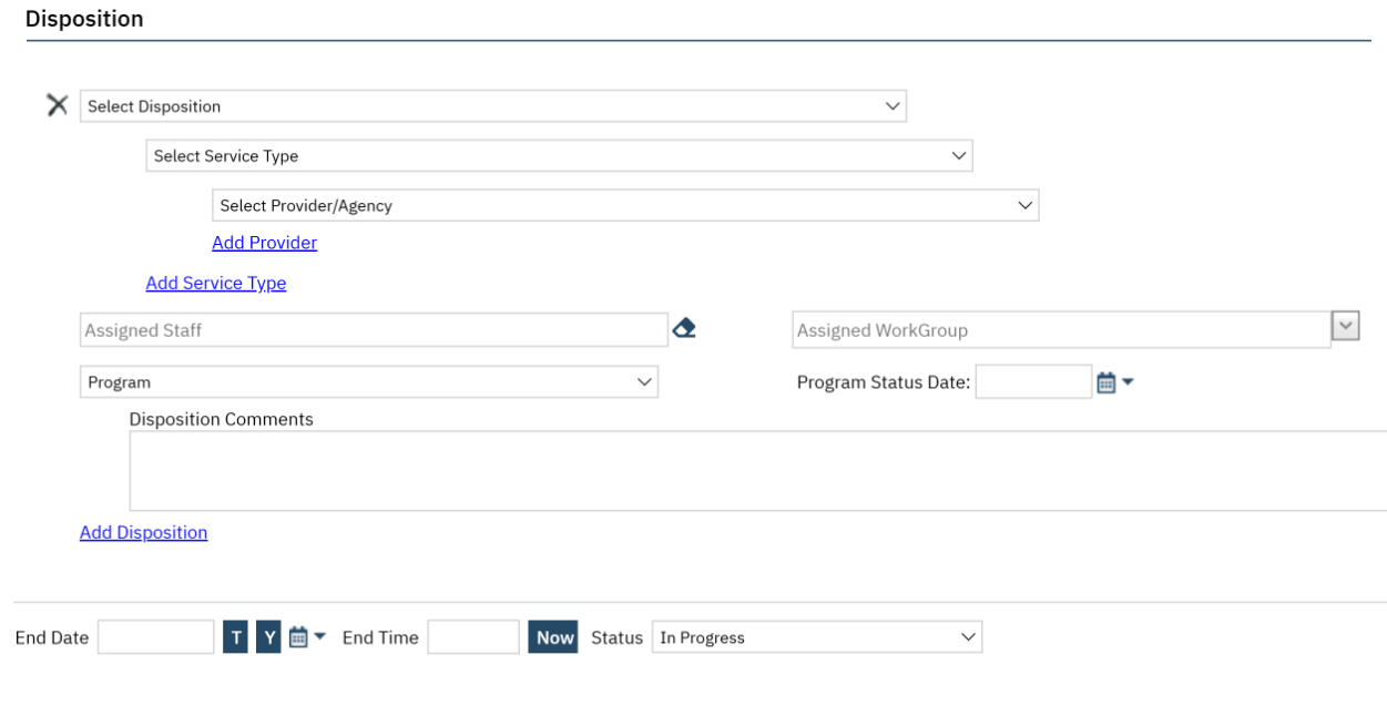 For certain dispositions (results of the inquiry), the Program fields will become available. These are used when referring a client to a program. By entering a Program name and a Program Status Date, the system will automatically put the client in “Requested” status for that program. This makes referrals much faster.