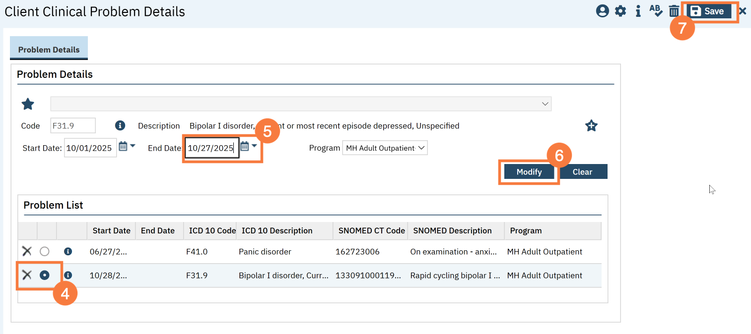 - This brings you to the Client Clinical Problem Details screen. In the Problem List section, click the radio button for the problem you need to resolve.