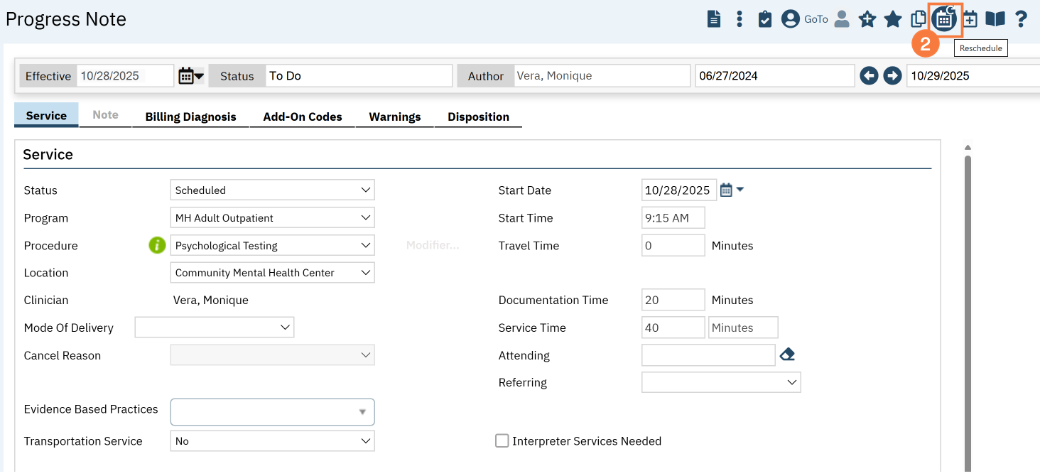 - From your SmartCare home page, locate the Appointments for Today widget. Click the appointment time to the right of the patient you need to reschedule.