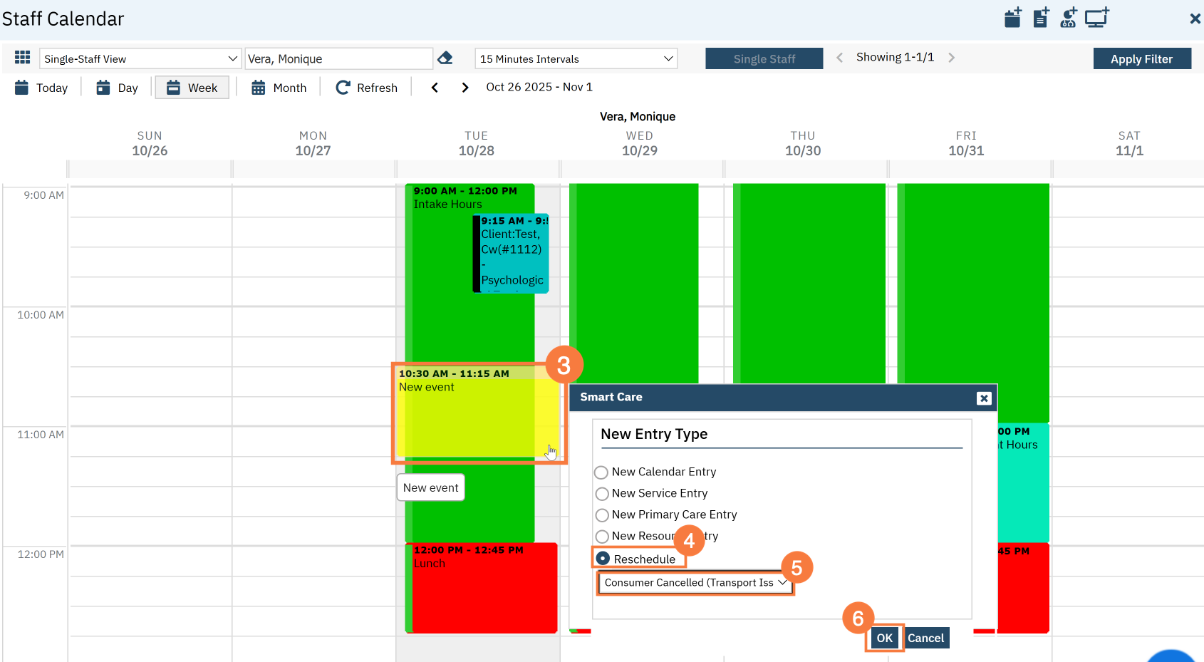 - Your Staff Calendar screen will open, click and drag your mouse on the calendar time slot you want to book.