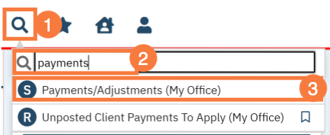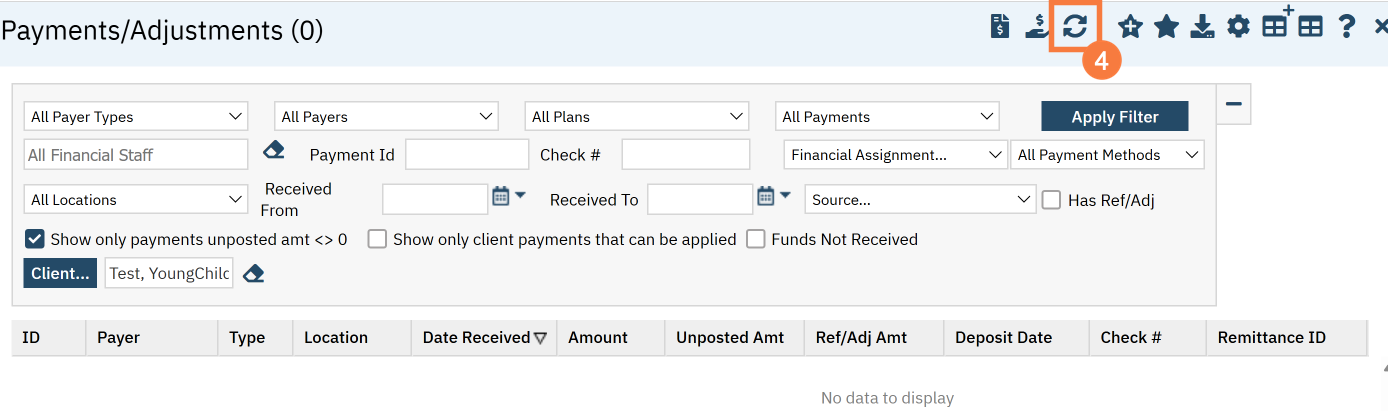- The Payments/Adjustments list page will open. Click on the ER Roll Back icon in the top right corner.