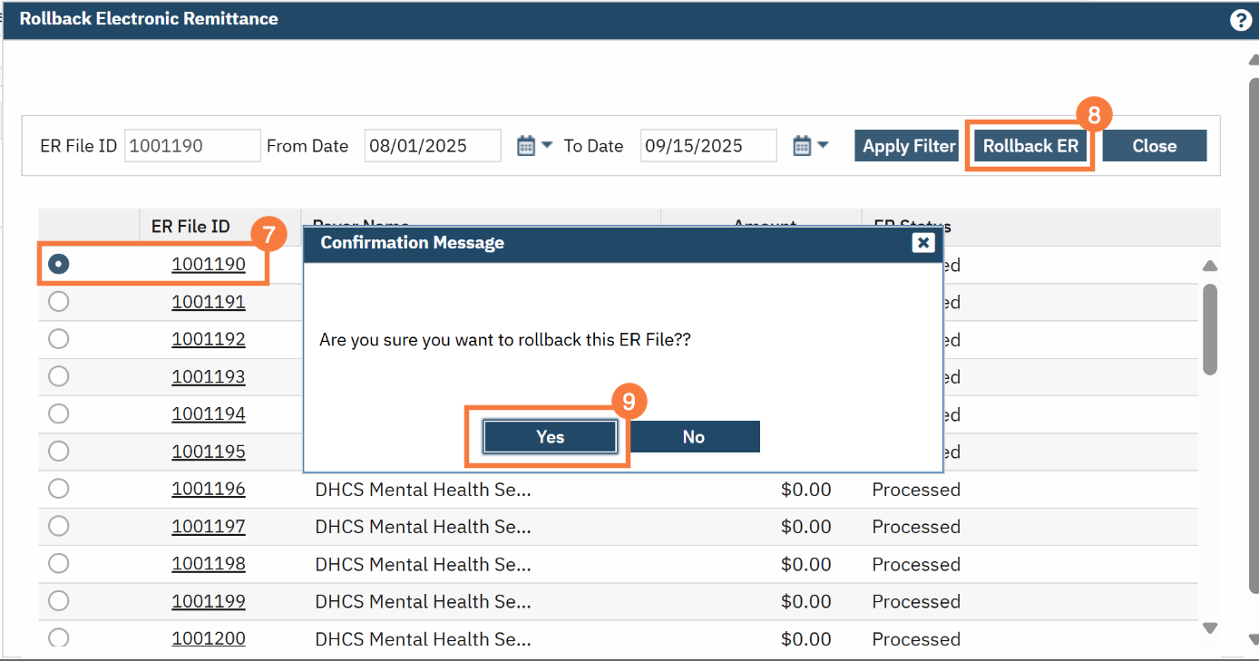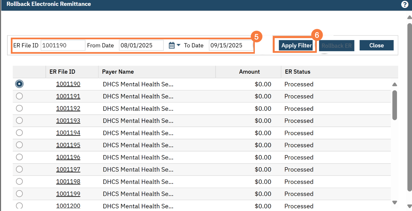 - Locate the ER file to be rolled back and click the radio button by the ER File Id.