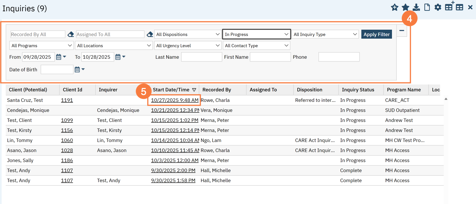 - This will bring you to the Inquiries list page. Use the filters as necessary, such as filtering the status to show only “In Progress”. The “Recorded By” column indicates who created the inquiry.