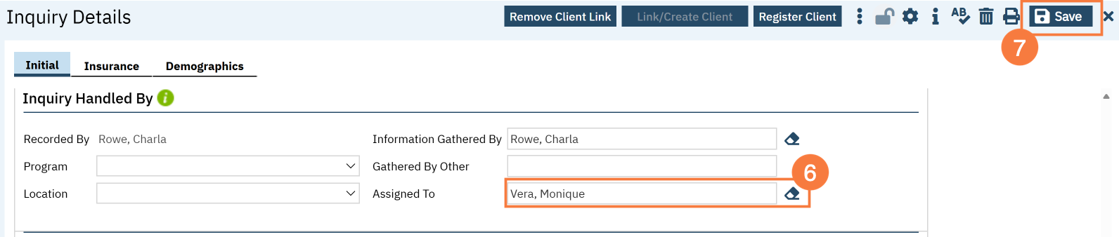 - Once in the Inquiry Details screen, you can assign the inquiry to a staff member by navigating to the “Inquiry Handled By” section and use the “Assigned Staff” field. This field shows on the Inquiries list page, meaning staff can sort by inquiries that are assigned to them.