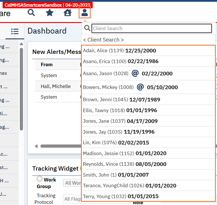 Once you’ve been added to the client’s treatment team, you should be able to see the client when you click on the Client Search icon. This allows you to quickly access any clients on your caseload. If you don’t see a client on this list and you know you’re on their treatment team, reach out to your system administrator.