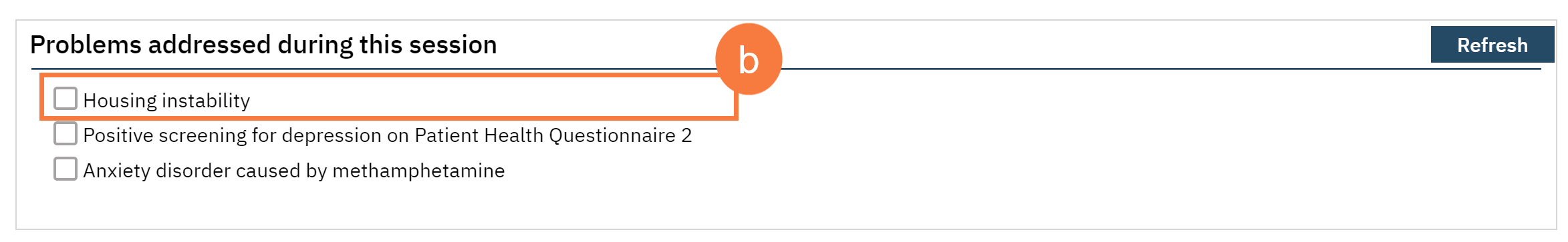 - Select which problems you addressed in today’s session. If you added a problem in step 3a above and don’t see the problem on this list, click the Refresh button.