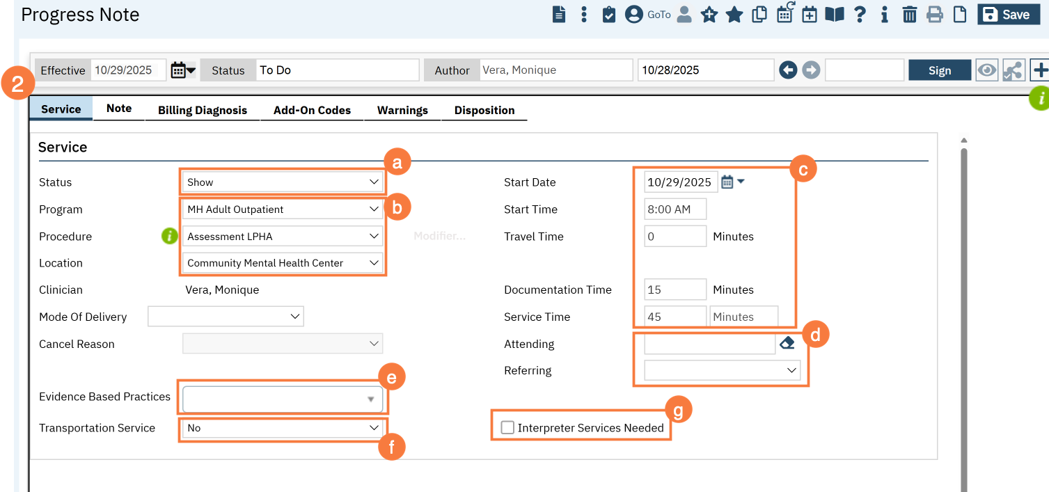 - If the status of the service is “Show”, you may now click on the Note tab. Complete the progress note tab. This note type may look different depending on the procedure code you have chosen. Most will include 3 fields: the Problem List section, the Note section, and the Care Plan section.