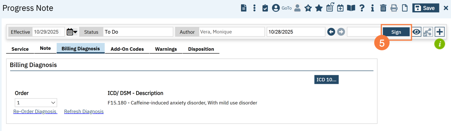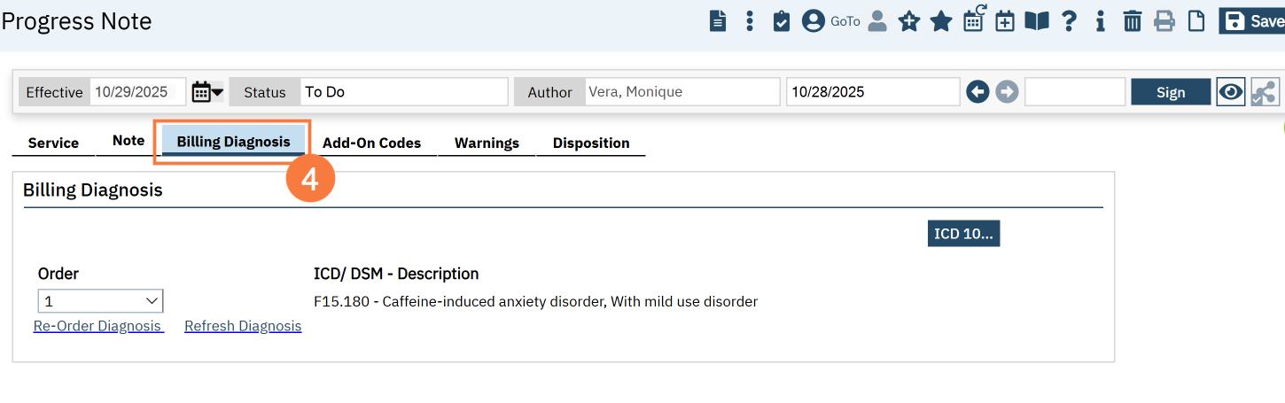 - The Billing Diagnosis tab will show you which diagnoses will be pulled onto the billing. You should generally ignore this tab for ongoing services. However, if you need to change the billing order, for example you want this note to focus on the secondary diagnosis, you can re-order the diagnoses to match your service without changing the overarching diagnosis form.