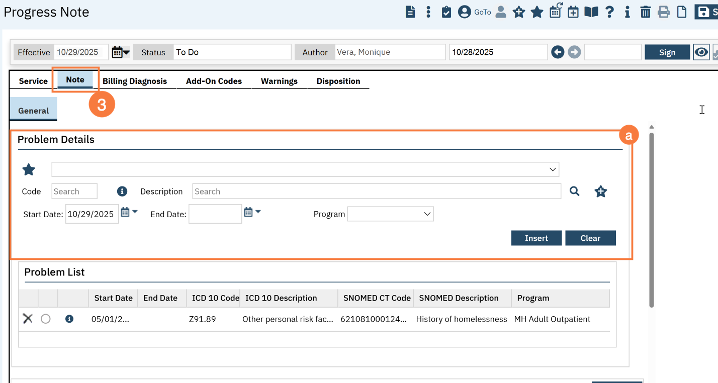- If you want to add problems to the problem list, you can do so here. Search for the problem using either the Code or Description field, enter the start date, and select your program. Then click Insert.