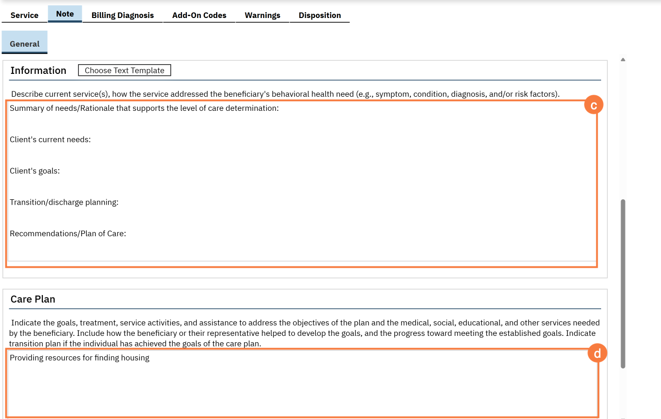 - Enter your plan of care in the Care Plan section. For services that require a treatment plan with specific items, this is where the treatment plan is entered. This information will pull forward from the most recent service note in the same program. There may be text templates available for specific treatment plan requirements.