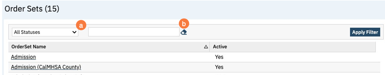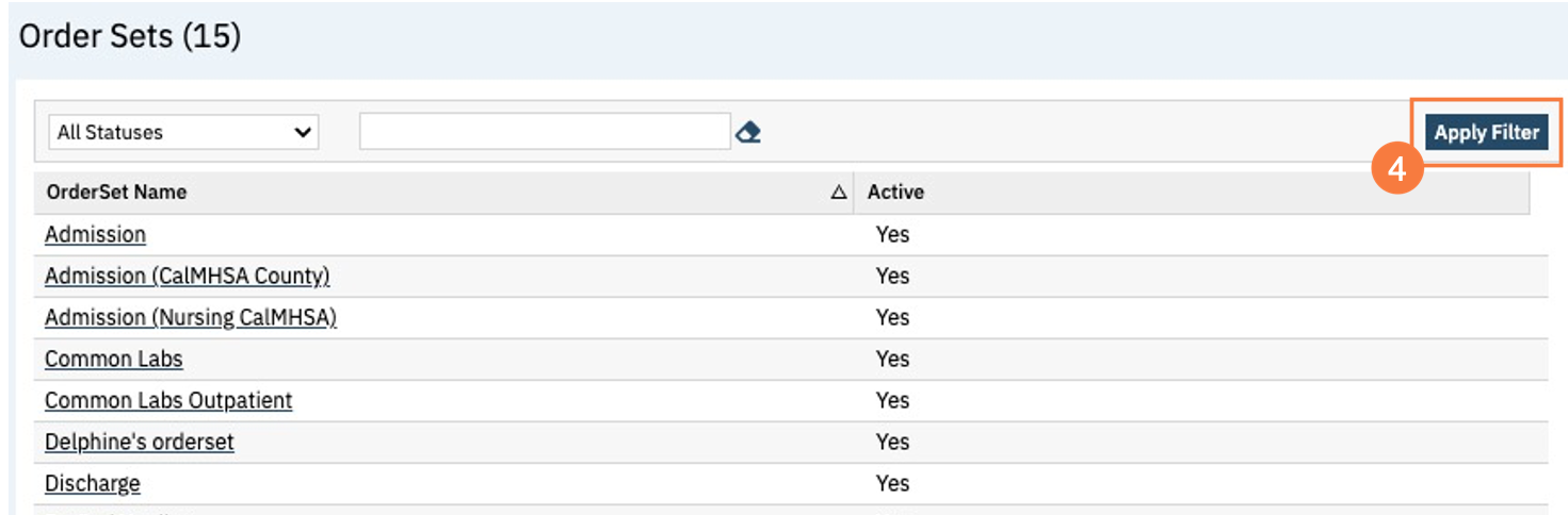 - This will bring up the Order Sets (Administration) list page. If need you can use filters to narrow down the data displayed below and click Apply Filter.